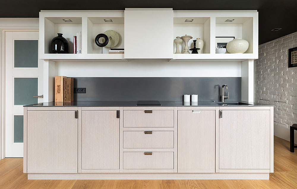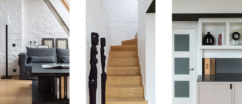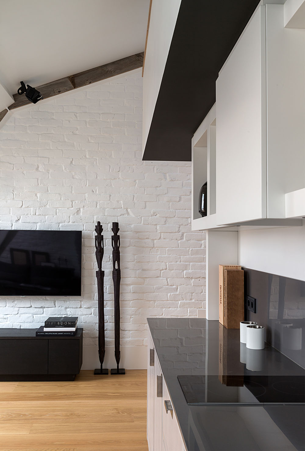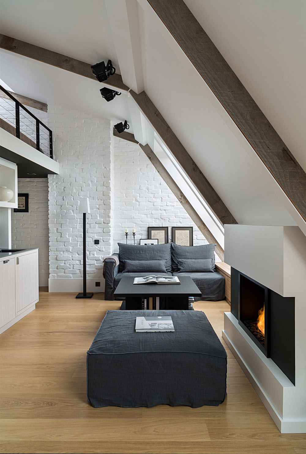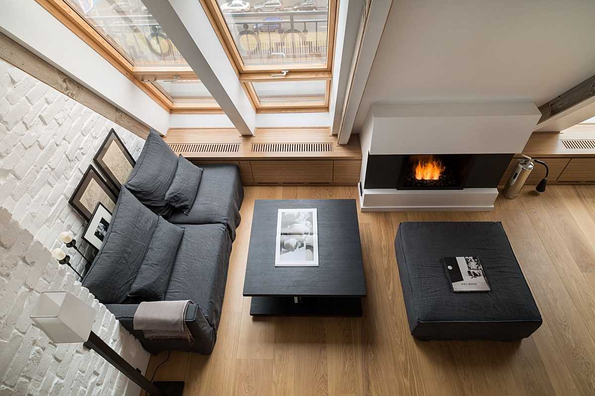 Единственное, что осталось скрыто, это ванная комната и гардеробная. Для компактной кухни места оказалось вполне достаточно, образ жизни молодого человека не требовал обустройства полноценной зоны готовки. В квартире нашлось место даже для камина. Из-за расположения под самой крышей, проблем с обустройством дымоход не возникло. Компактный диван и телевизор заняли самое подходящее место.