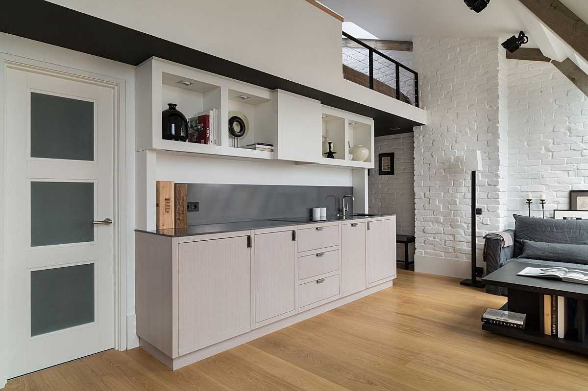 Открытая планировка позволила создать воздушное пространство, в котором, несмотря на небольшие габариты, довольно просторно. Вместо этого дизайнеры могли разделить комнату на две части: в одной оформить кухню, а в другой – спальню-гостиную. При этом комнаты были бы довольно тесные, высота потолка никак не использовалась бы. Нестандартная планировка – идеальное решение для такого сложного помещения.