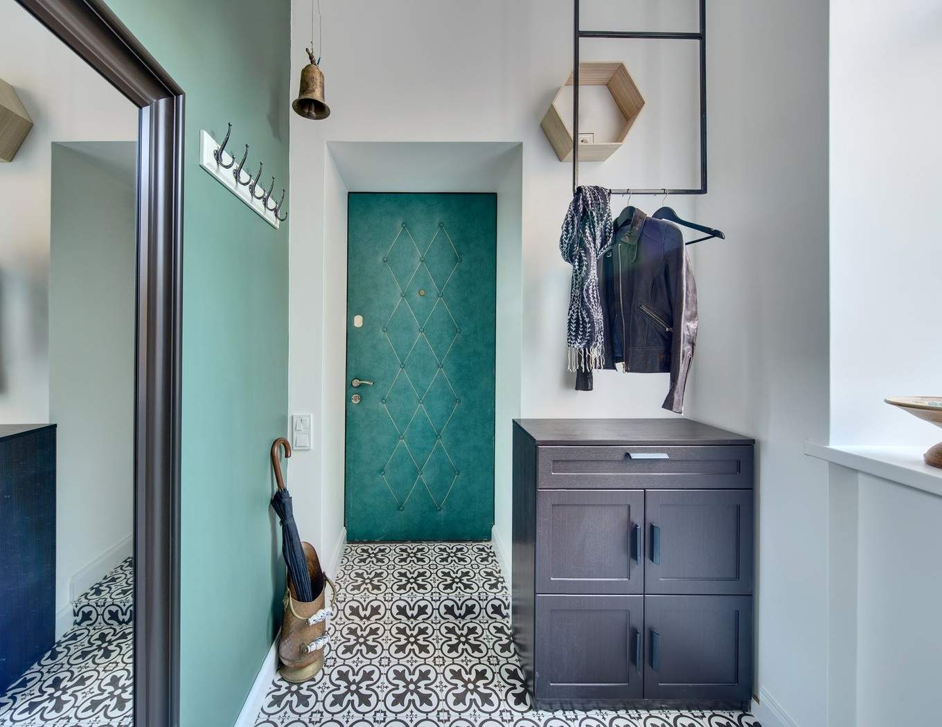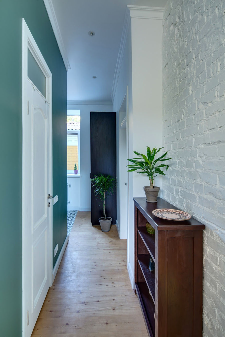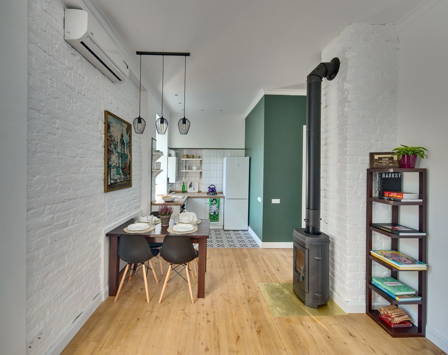 Эта маленькая квартира расположена в историческом центре Киева. До ремонта она представляла собой квадратное помещение без каких-либо внутренних стен. Дизайнер Майя Баклан из студии «Неевроремонт» решила возвести несколько перегородок, чтобы разделить пространство на две части. В большей половине расположена кухня-гостиная, откуда есть выход на балкон, в меньшей – спальня. Квартира планируется сдаваться в аренду, поэтому большого шкафа для хранения не предусмотрено. В прихожей есть подвесная шканга для верхней одежды и небольшая тумба для обуви, а в спальне для одежды предусмотрен комод. Для дополнительного хранения может быть использованы выдвижные ниши в самой кровати и тумбочка под телевизором.