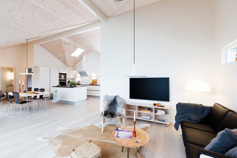 Выполненный из дерева от пола до потолка, этот датский деревянный дом вдохновляет естественной красотой как снаружи, так и внутри. Эффектности добавляют большие окна, наполняющие интерьер дневным светом. В гостиной комнате одна из стен полностью выполнена из стекла, благодаря чему открывается панорамный вид на зеленую лужайку. Уюта и тепла интерьеру гостиной добавляет небольшой камин в промышленном стиле. Кожаная мебель, мех, светильники создают особый стиль этого дома, а с помощью черного цвета расставлены акценты. В доме есть 4 спальни, а для гостей обустроены 10 спальных мест. Для развлечения или расслабления здесь найдется сауна и бильярдный стол, который можно переоборудовать в теннисный стол.