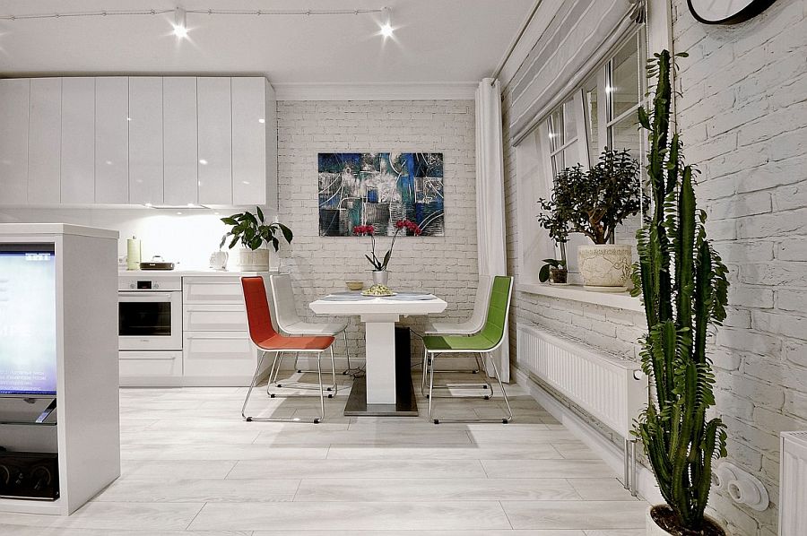 — отдавайте предпочтение светлым цветам отделки, но при этом делайте яркие акценты с помощью кирпичной кладки или ярких обоев с принтом или узором. Но использование черного цвета не стоит исключать