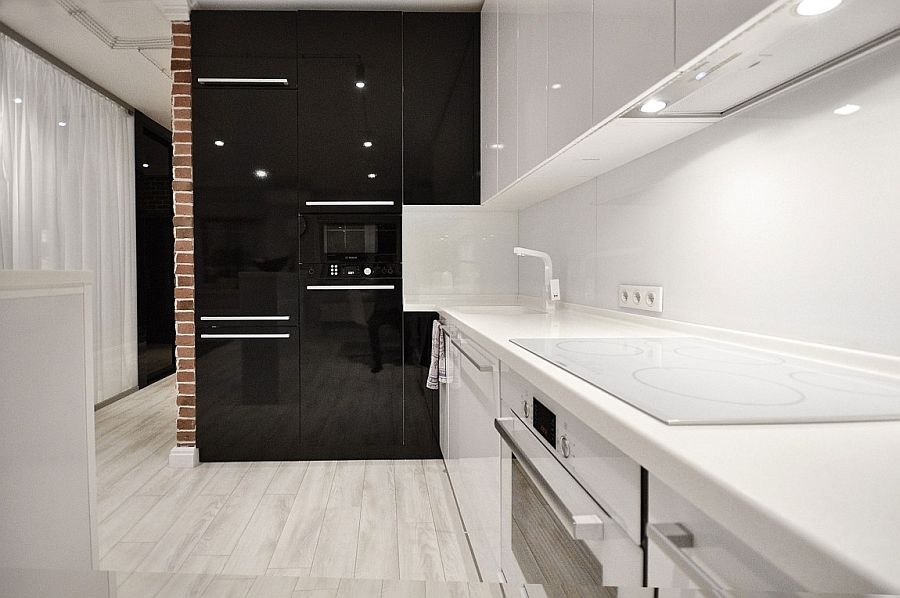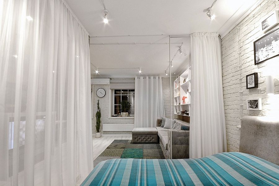 При оформлении дизайна однокомнатной квартиры в первую очередь необходимо определится с планировкой и стилем. Скандинавская простота и шик легки в основу интерьера квартиры на фото. Здесь сочетание кирпичной кладки с белым и черным цветами, безусловно, очень оживляет маленькое пространство и задает ритм. На первый взгляд она даже не кажется такой маленькой. Это впечатление возникает и благодаря объединению спальни, гостиной и кухни в едином пространстве, разделение между которыми являются стеклянные перегородки и белые занавески.