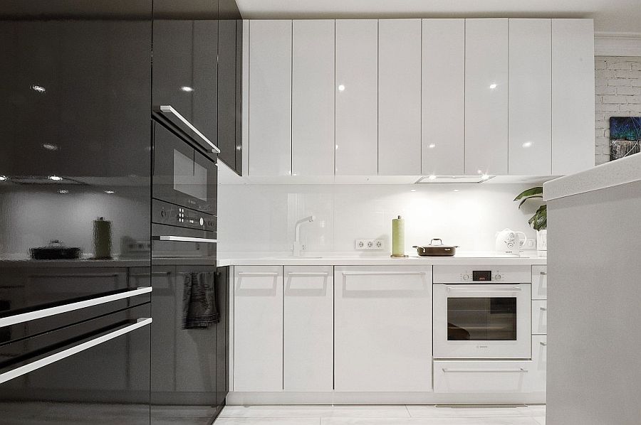 Для хранения в интерьере использован большой шкаф с глянцевой поверхностью в прихожей. Вообще, глянец всегда оживляет дизайн, поэтому в маленьких помещениях его рекомендуют использовать.