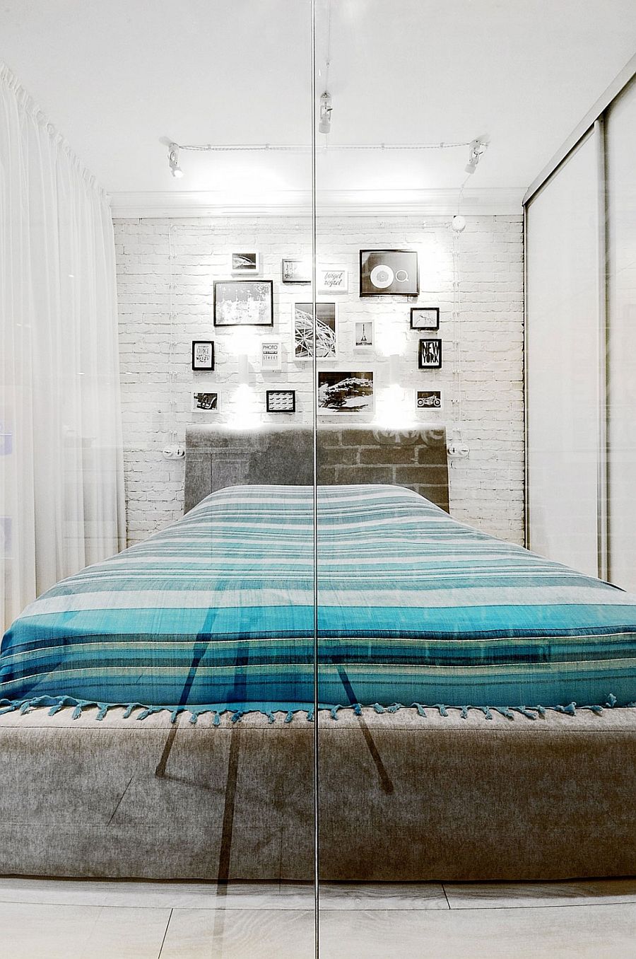 В этом скандинавском интерьере используется модульная ТВ-установка, которая позволяет смотреть фильмы находясь, как в гостиной, так и в спальне. Стеклянные перегородки, отделяющие спальню, добавляют дизайну легкости, а светлые занавески — изящества.