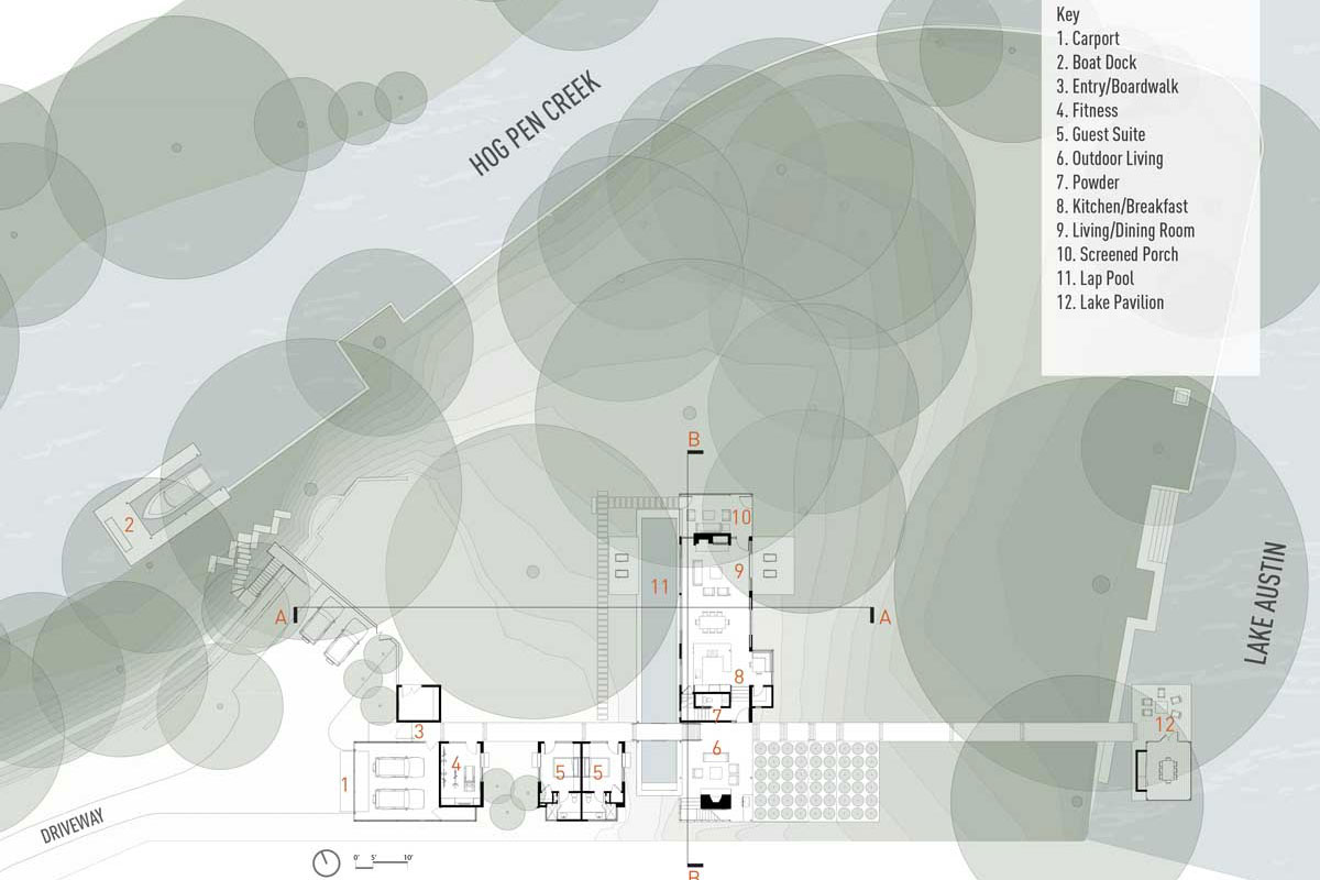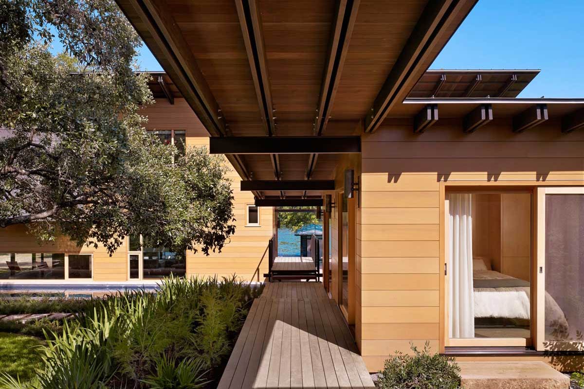 Он носит название Hog Pen Creek, так как с одной стороны окружен рекой с таким названием. По другую сторону дома, расположено озеро Остин. Это живописное место является частью Техаса. L-образную форму здания продиктовали архитекторам старые дубы, расположенные на территории резиденции. Владельцы пожелали, чтобы часть дома оставалась на открытом воздухе и именно здесь обустроили каминную зону. По соседству расположена закрытая двухэтажная часть дома, предназначеная для уединения. На нижнем этаже расположена гостиная и кухня, на верхнем – спальни и офис. На территории резиденции также есть гостевой домик, два гаража, небольшой фитнес-зал и бассейн. Одной из особенностей резиденции является терраса на озере Остин, расположенная прямо на воде. Этот дом, скорее напоминающий виллу для отдыха, получил две престижные награды в мире дизайна: AIA San Antonio Merit Award и Texas Society of Architects Design Award. Теперь любуйтесь и вы!