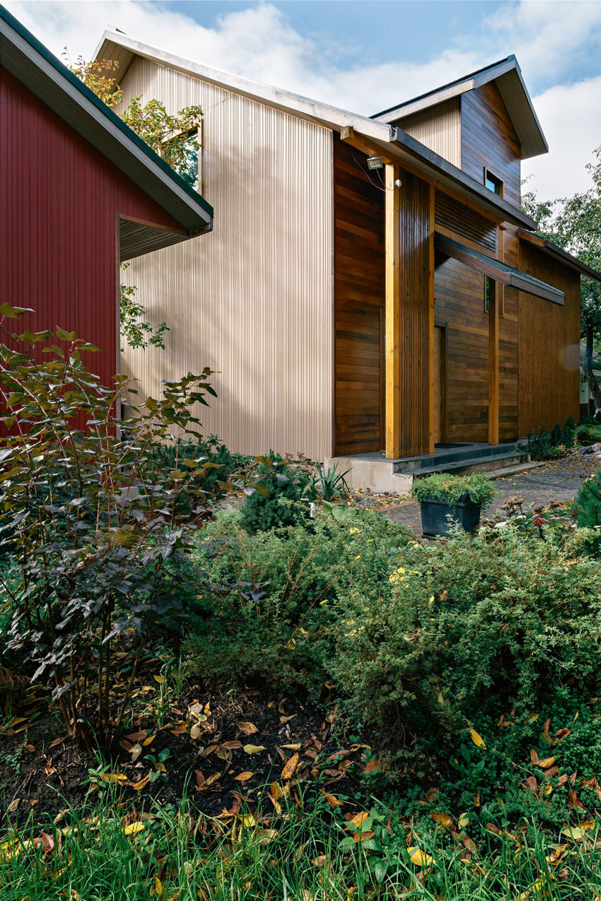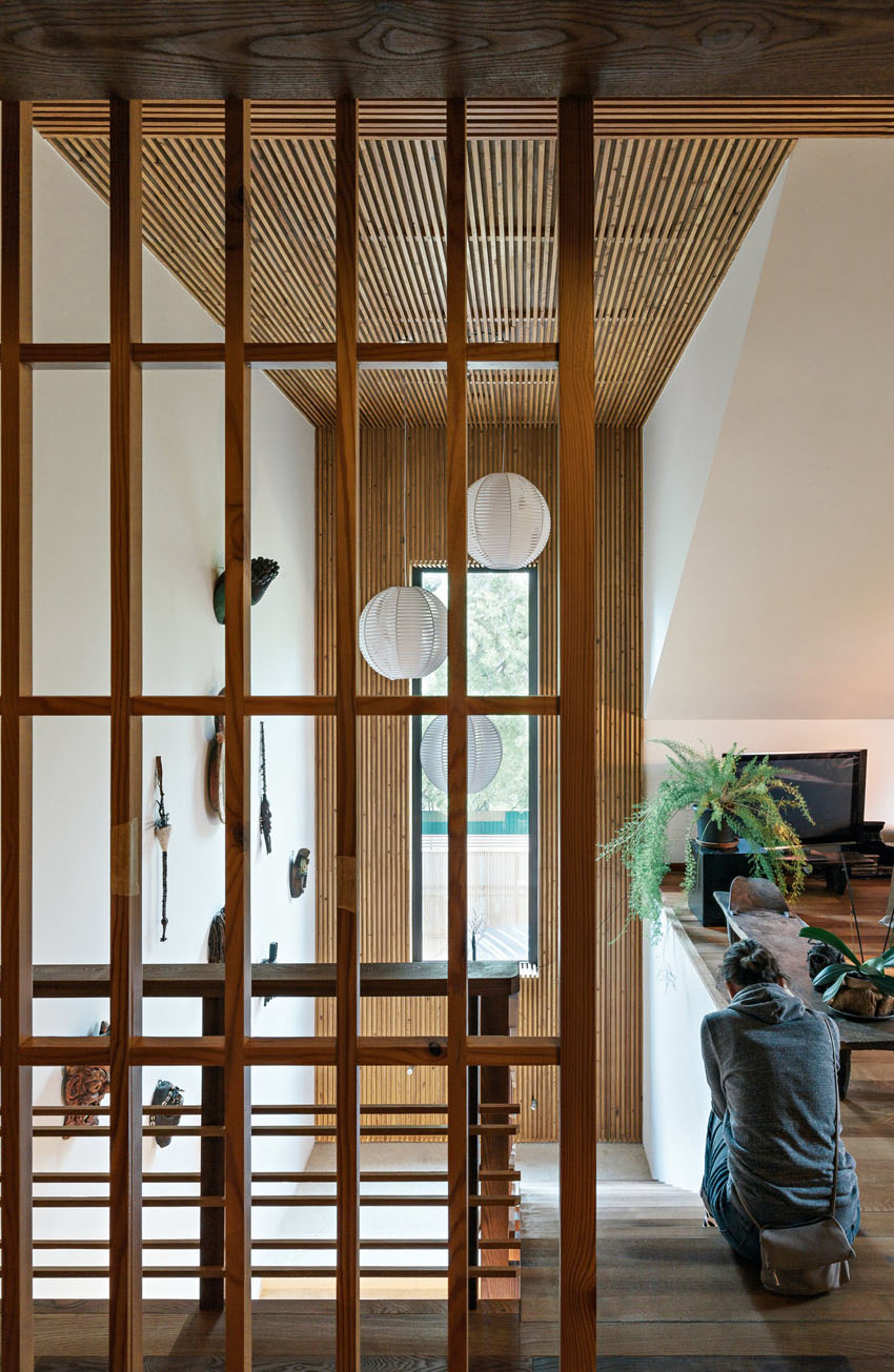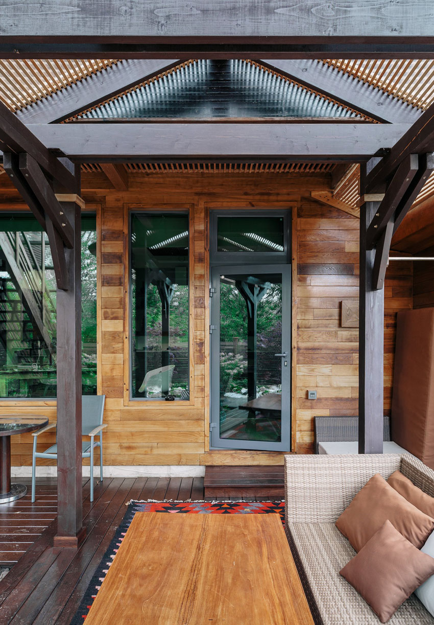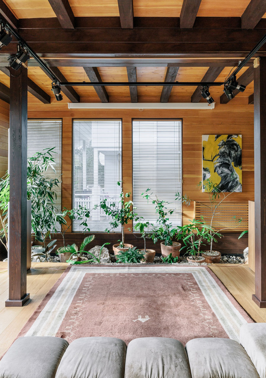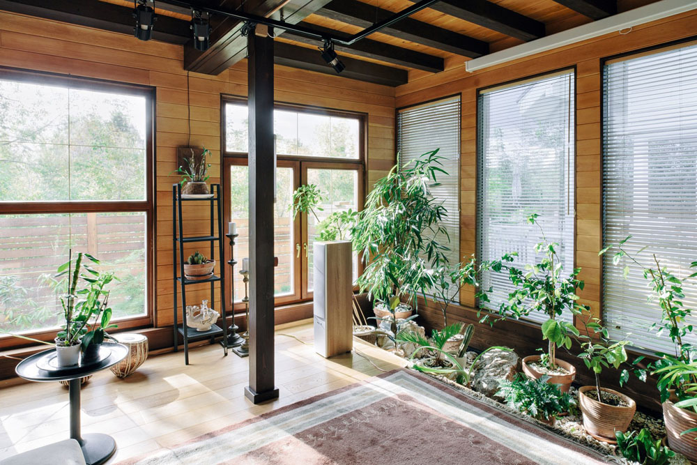 Место для сада нашлось не только на территории рядом с домом, но и в гостиной комнате. Кроме того зеленые растения расставлены по всему интерьеру, за счёт чего свежесть витает в воздухе.