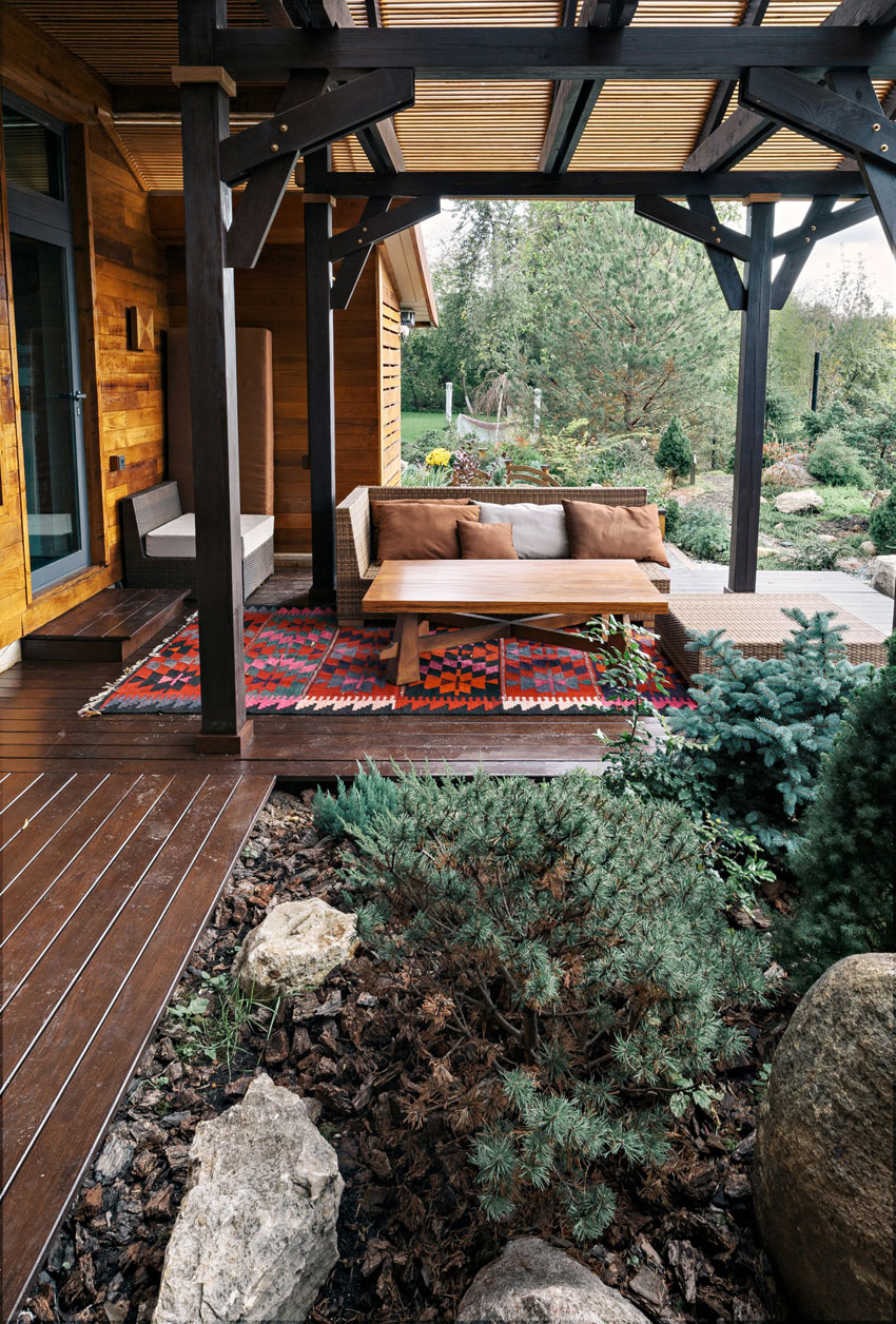 Со временем был оформлен и уютный сад, куда есть выход из гостиной. Терраса с деревянными балками рядом с маленьким прудом в окружение зелени кажется отличным местом для отдыха.
