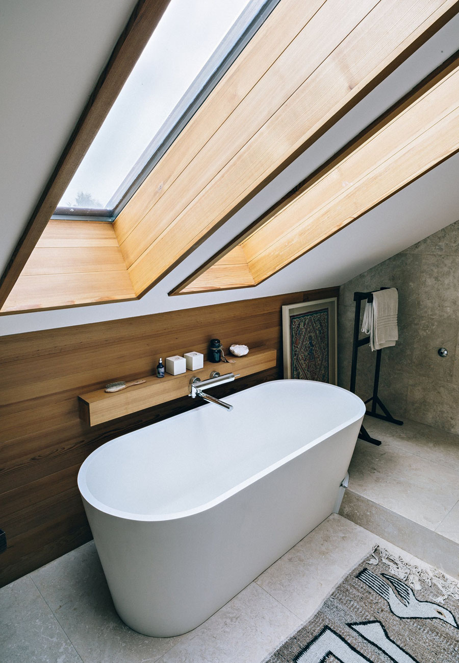 С деревянными элементами в отделке работал плотник, который со временем уже делал мебель по эскизам заказчика. Так была изготовлена лавка на кухне, стеллажи по обе стороны в гостиной, обеденный стол и кровать в главной спальне.