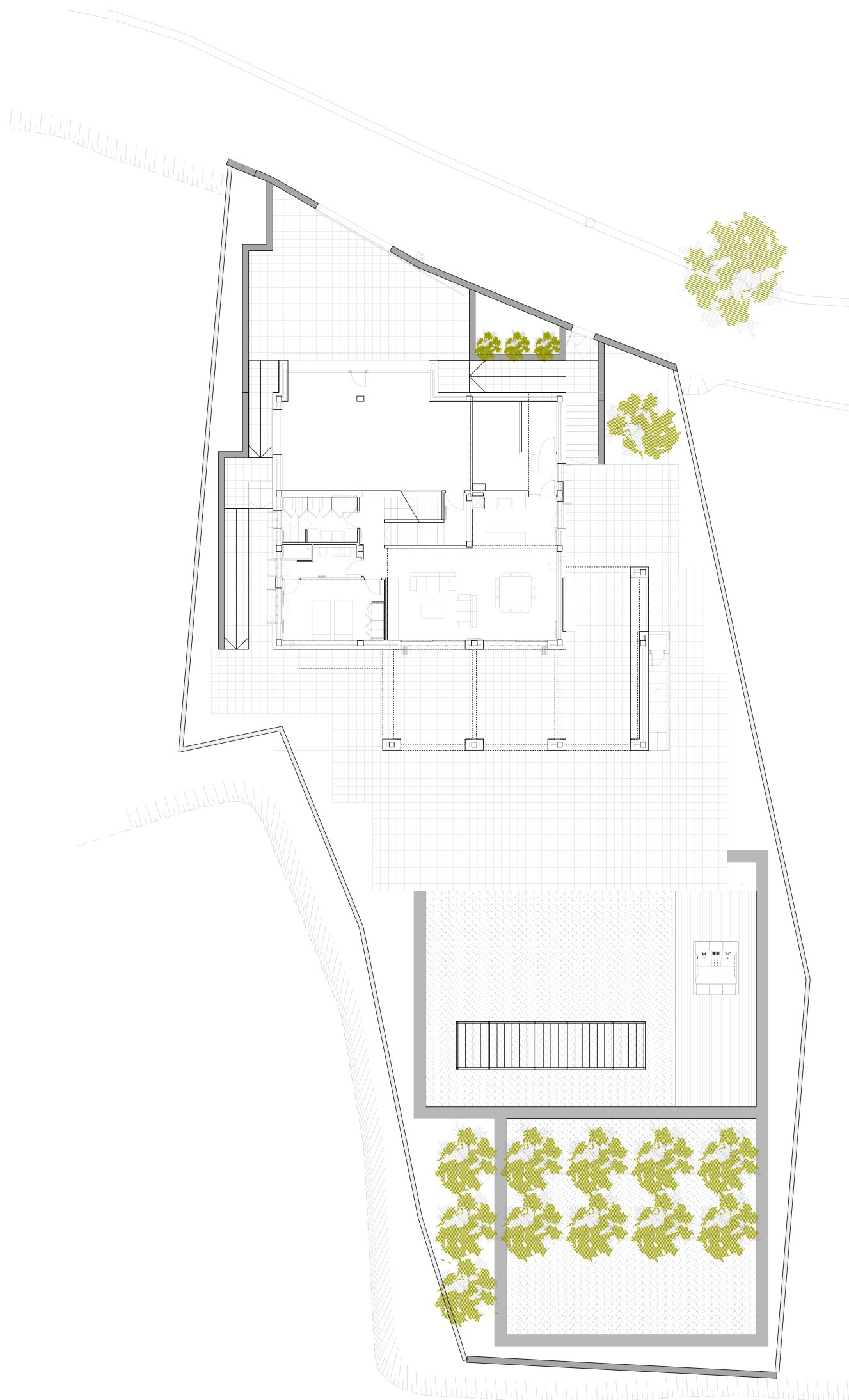 Общая площадь виллы 400 кв. м. На первом этаже расположена гостиная, кабинет, гостевая спальня и комната для отдыха. Здесь есть выход на красивую террасу, где вы найдете открытую кухню, места для отдыха, а также небольшой джакузи. Этажом выше находятся три спальни и три ванные комнаты, гостиная, кухня и столовая. Фух…просто дух захватывает от масштабов этого дома. Помимо этого, на втором этаже расположена терраса, на которую можно подняться с улицы. Ступени, ведущие к ней, являются частью архитектуры дома.