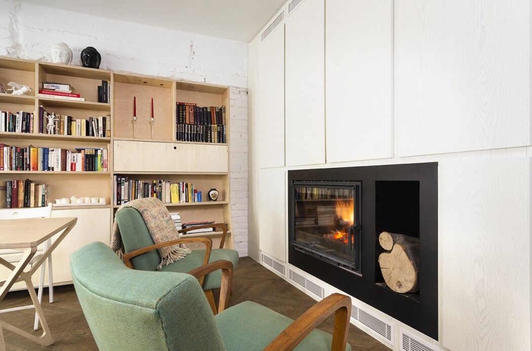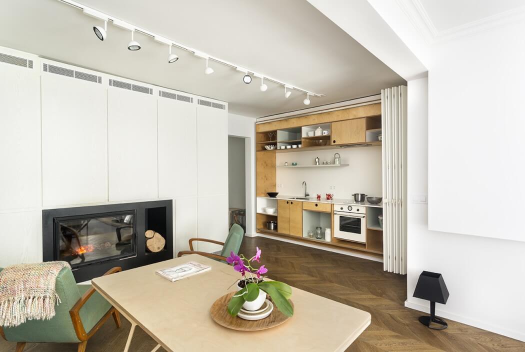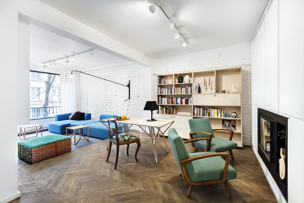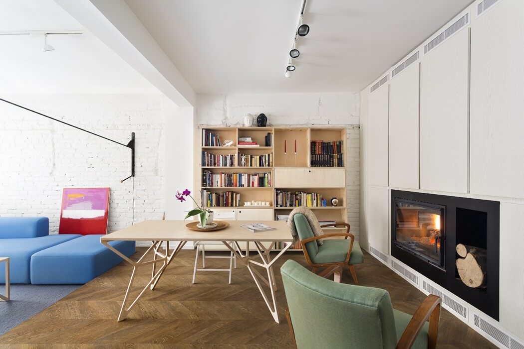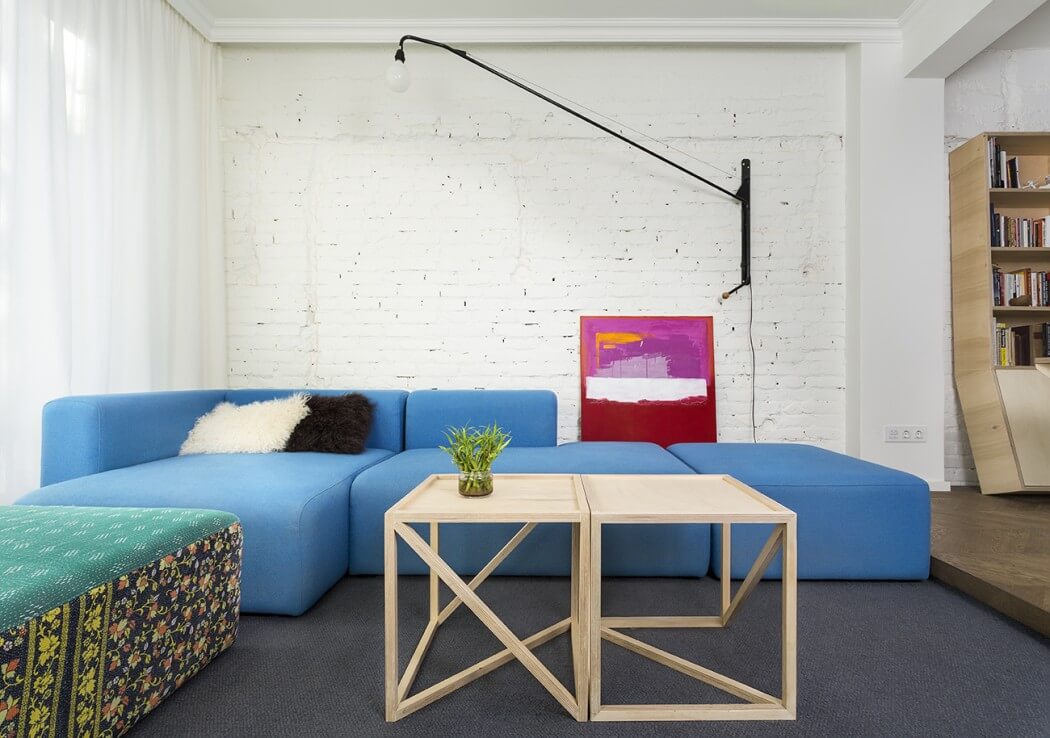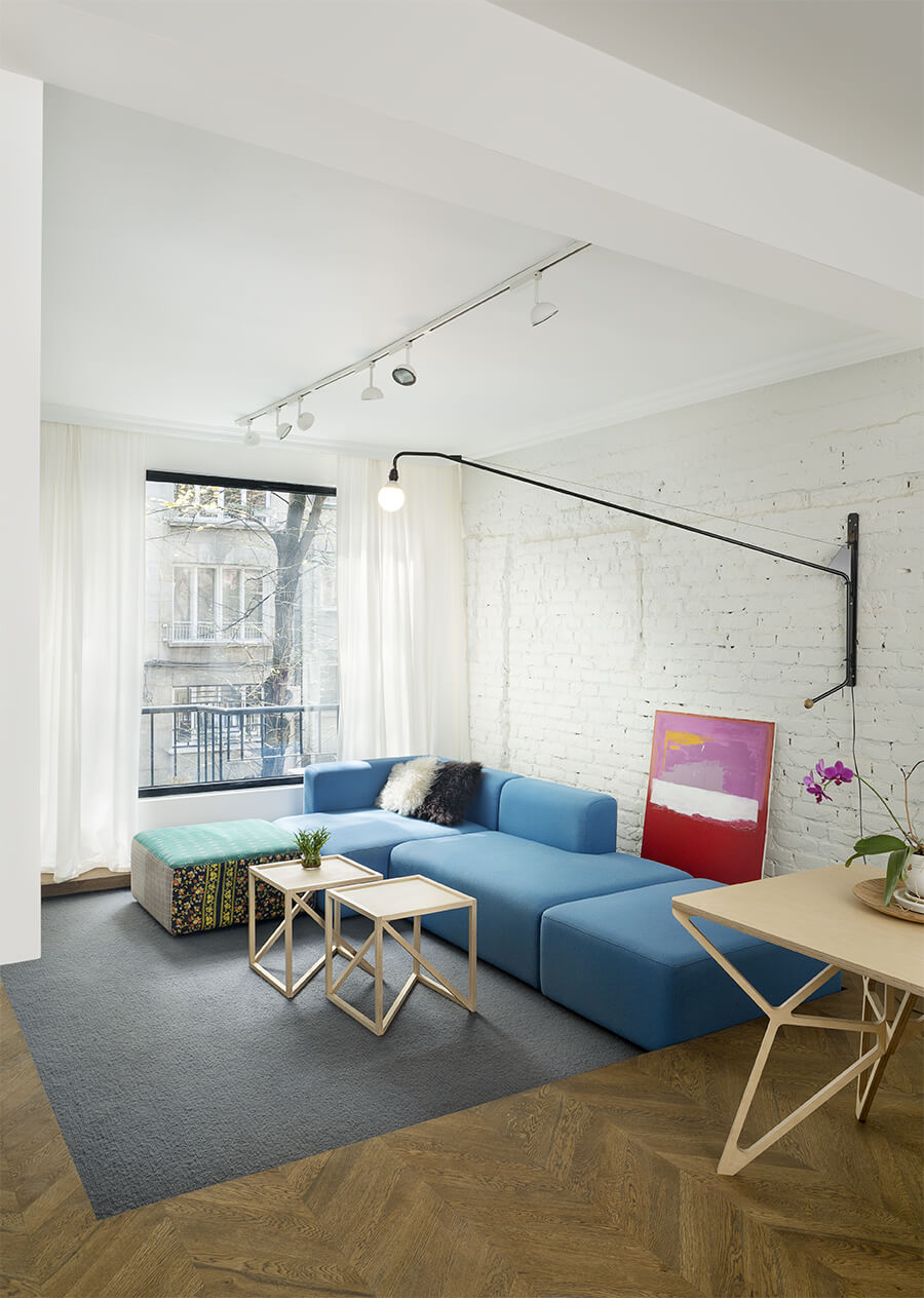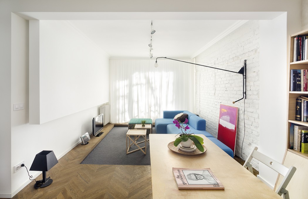 Квартира в скандинавском стиле из Софии расположена на первом этаже старого здания. Основная цель проекта заключалась в максимальном потреблении естественного света и создание комфортных условий для жизни. На небольшом пространстве дизайнерам удалось разместить полноценные зоны, используя при этом хитрости планировки. Творческие идеи для хранения могут быть замечены по всей квартире; даже встроенная кухня, сделанная из фанеры, может быть скрыта за белыми раздвижными дверями. Холодильник скрыт за белыми фасадами у другой стены. Для зоны отдыха с креслами и камином также нашлось место в гостиной. Благодаря красивой кирпичной отделке интерьер выглядит очень стильно, синий диван при этом идеально вписывается в светлый дизайн. Наслаждайтесь!