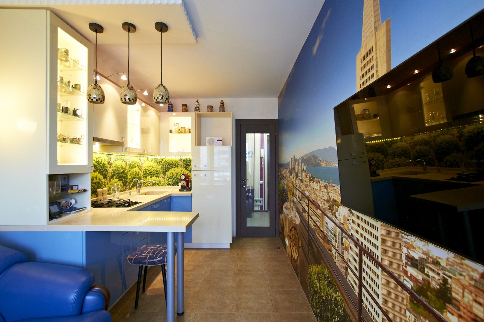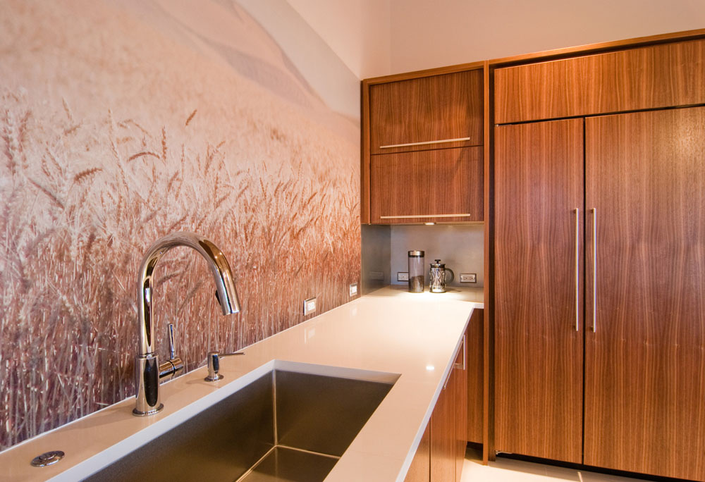 С помощью фотообоев для кухни можно создать очень современный и стильный дизайн. Выбирайте красивый рисунок, который будет радовать вас каждое утро. Это может быть панорама города, зеленый пейзаж, фрукты, животные и т. д. Оклейку такими обоями выполняют по обычной технологии с помощью клея.