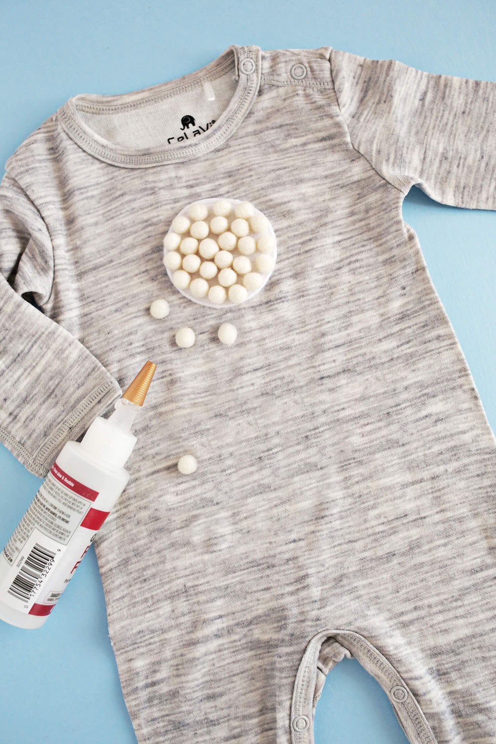 Шаг второй: С помощью клея для ткани приклейте все шарики и для надежности каждый из них пришейте нитью.