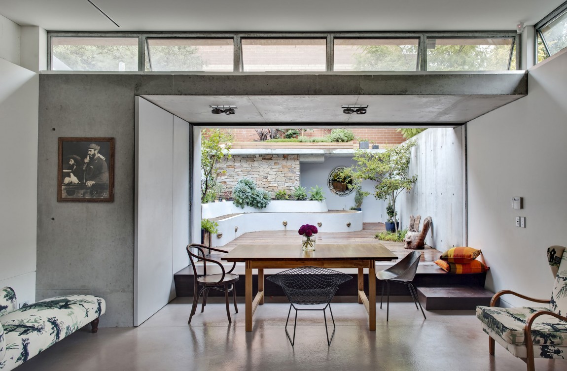 С другой стороны дома есть небольшой уютный внутренний дворик, который можно объединить со столовой и кухней. Внутренний интерьер также оригинален, как и архитектура: он является ее гармоничным продолжением. Благодаря обилию дерева, холодный белый дизайн выглядит совсем иначе. Его украшением являются дизайнерские вещи, светильники и мебель.