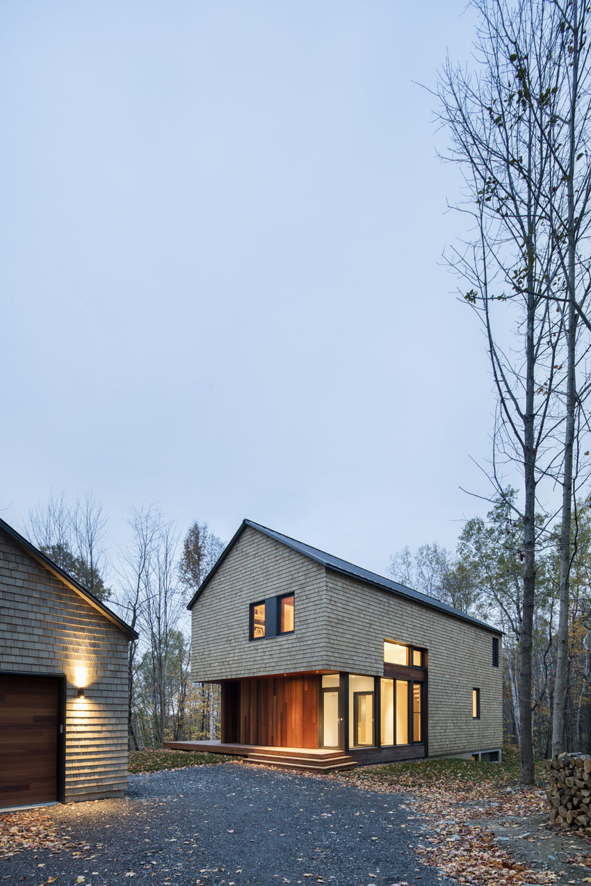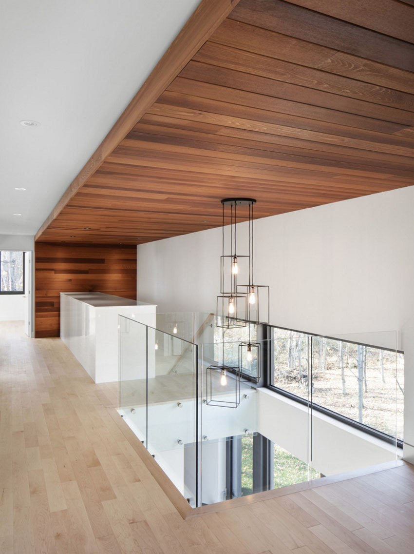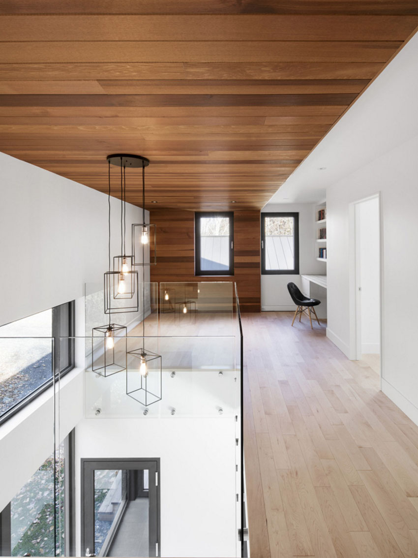 Этот стильный дом от Bourgeois/Lechasseur Architects расположен в Квебеке, Канада. Его фасад отделан дранкой из натурального кедра, благодаря чему он отлично вписывается в лесной ландшафт. К тому же, естественная текстура дерева смягчает грубую архитектуру дома. Первый этаж имеет множество панорамных окон, обеспечивая тем самым, прекрасный обзор на лес и близь лежащий ручей. Открытое пространство первого уровня вертится вокруг минималистичной кухни, рядом с которой расположена зона отдыха с камином. На втором уровне расположен домашний офис, спальни и ванная комната. Как и снаружи, интерьер дома отделан с помощью дерева, которое делает холодный минималистичный дизайн более уютным. В интерьере вы также найдете стильную современную люстру, длина которой равна высоте этажа. Ну как вам?