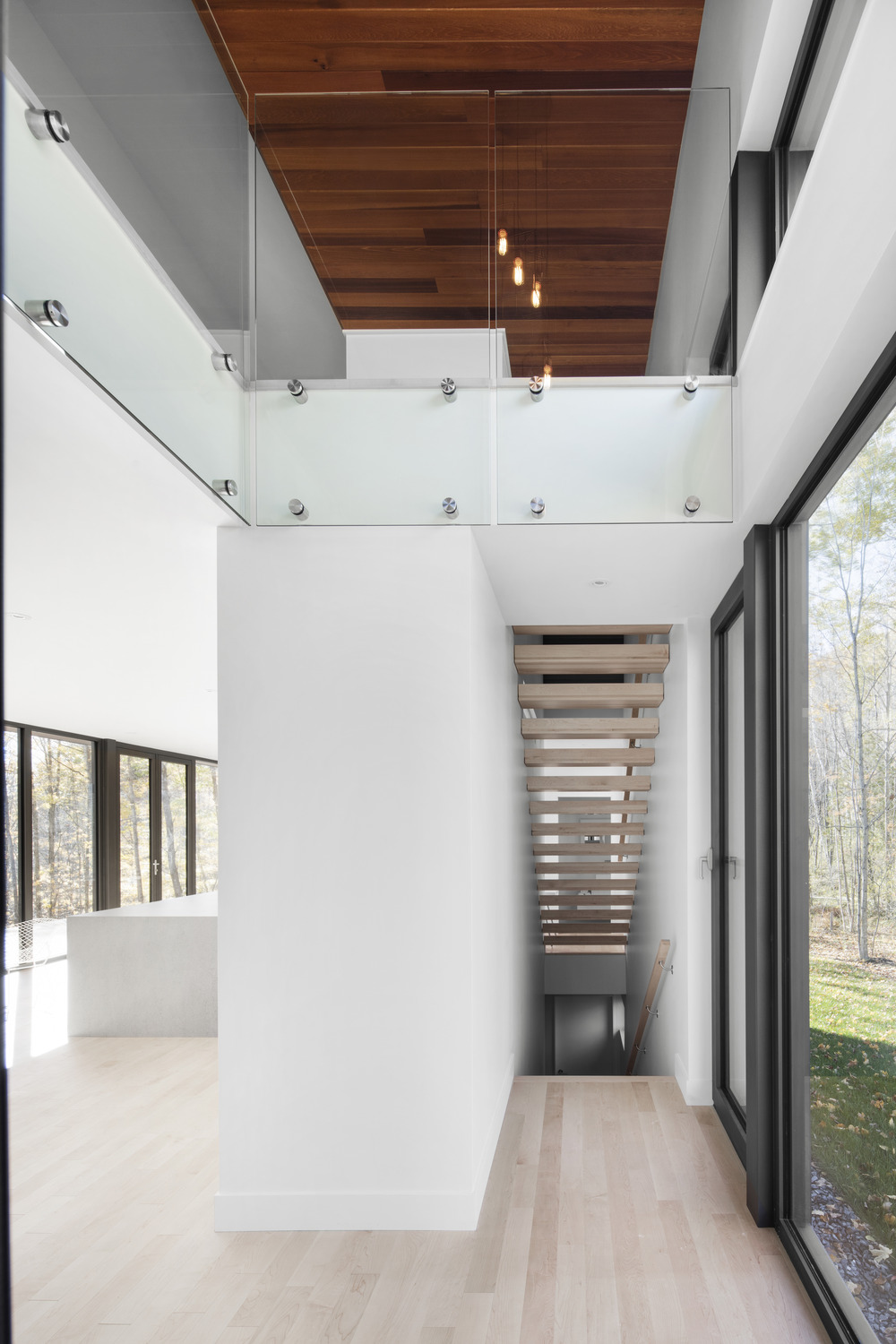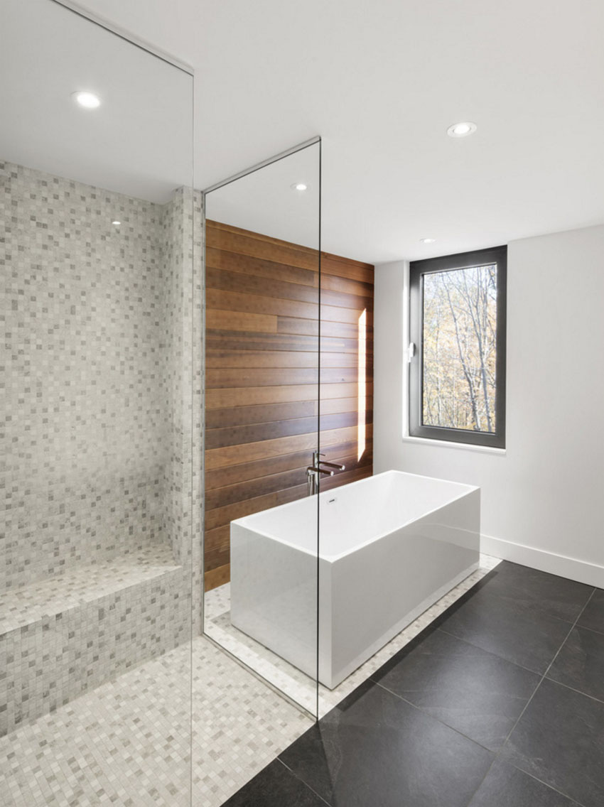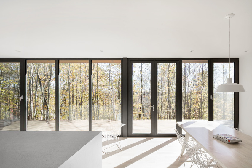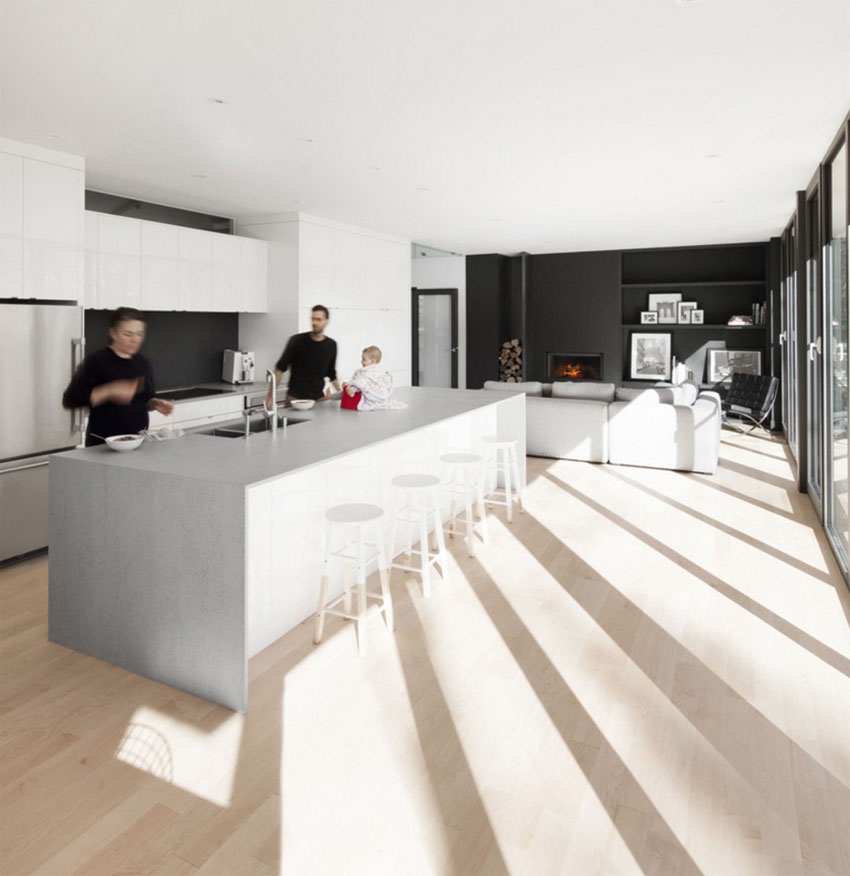 Этот стильный дом от Bourgeois/Lechasseur Architects расположен в Квебеке, Канада. Его фасад отделан дранкой из натурального кедра, благодаря чему он отлично вписывается в лесной ландшафт. К тому же, естественная текстура дерева смягчает грубую архитектуру дома. Первый этаж имеет множество панорамных окон, обеспечивая тем самым, прекрасный обзор на лес и близь лежащий ручей. Открытое пространство первого уровня вертится вокруг минималистичной кухни, рядом с которой расположена зона отдыха с камином. На втором уровне расположен домашний офис, спальни и ванная комната. Как и снаружи, интерьер дома отделан с помощью дерева, которое делает холодный минималистичный дизайн более уютным. В интерьере вы также найдете стильную современную люстру, длина которой равна высоте этажа. Ну как вам?