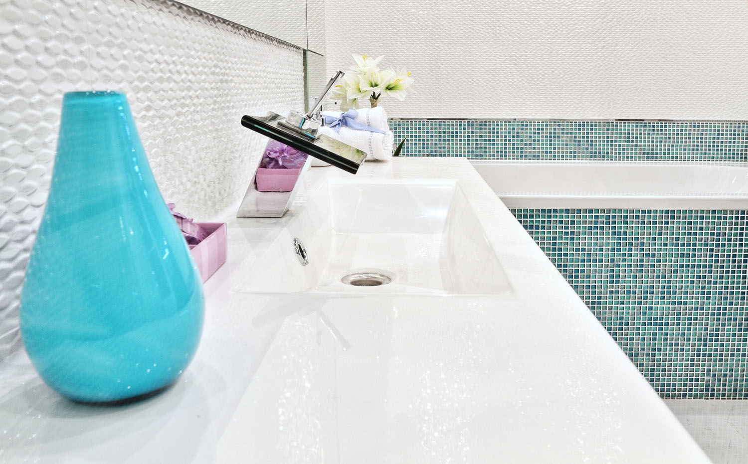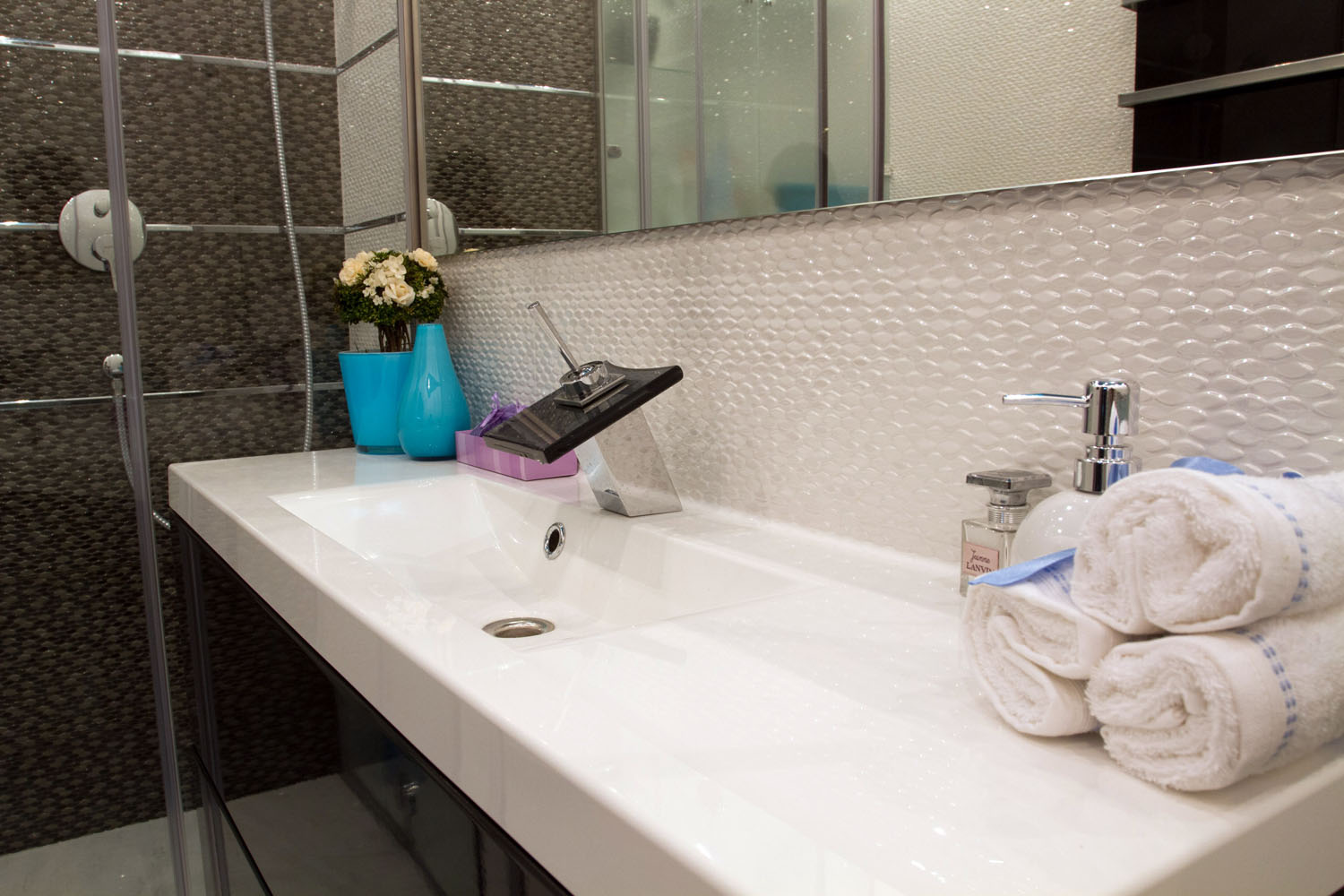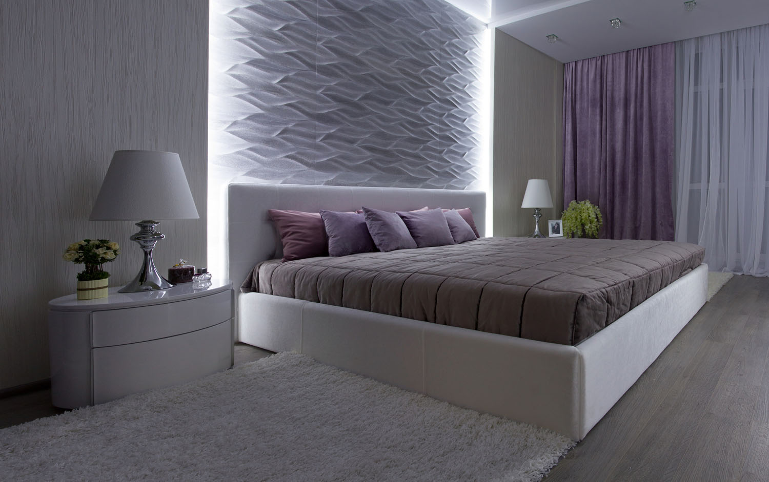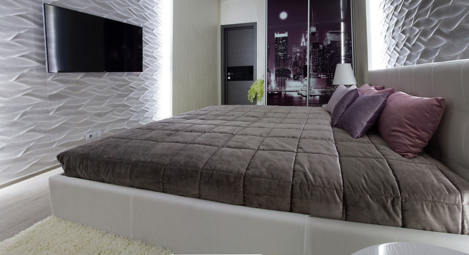 Роскошно выглядит и интерьер спальни. Для отделки стен использована плитка, имитирующая высеченные узоры волны на светло-сером камне. В блестящей отделке санузлов также присутствует нотка морской свежести. Материалы, примененные в отделке, продолжают идею атмосферы частного дома, расположенного где-то в теплых краях. Несомненно, этот дизайн квартиры в Киеве очень стильный и современный, он идеально сочетает пропорции уюта и практичности. Наслаждайтесь!