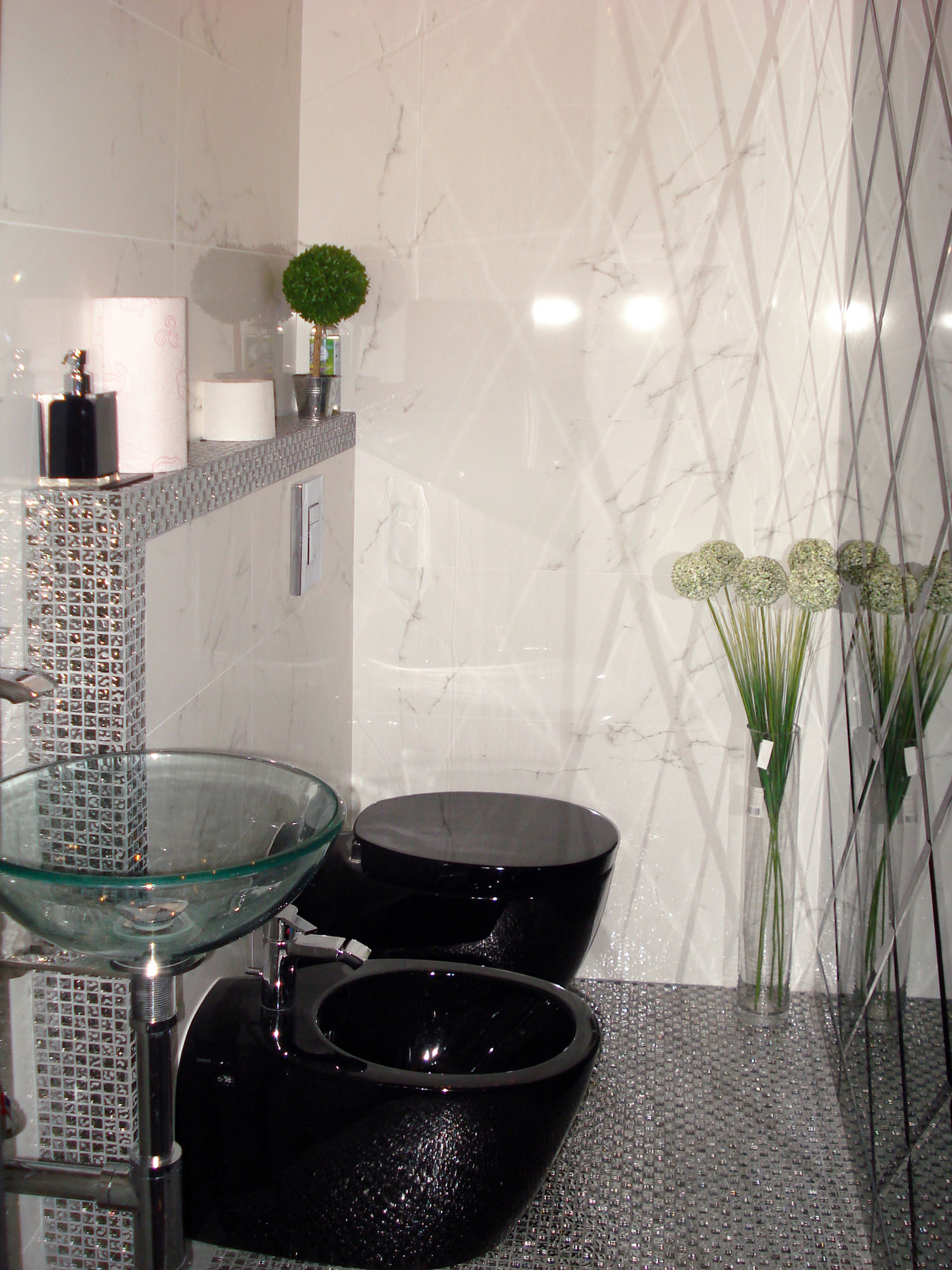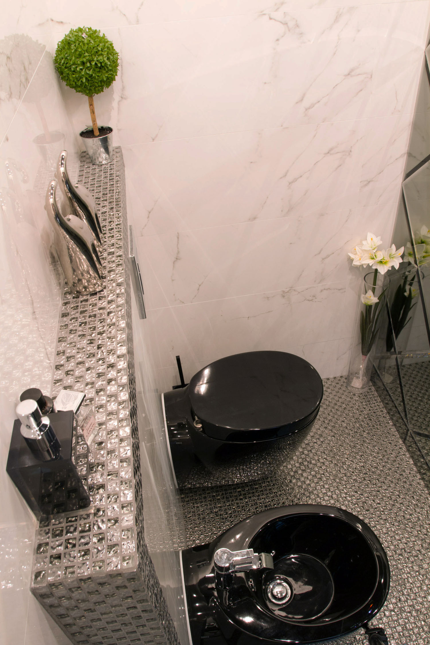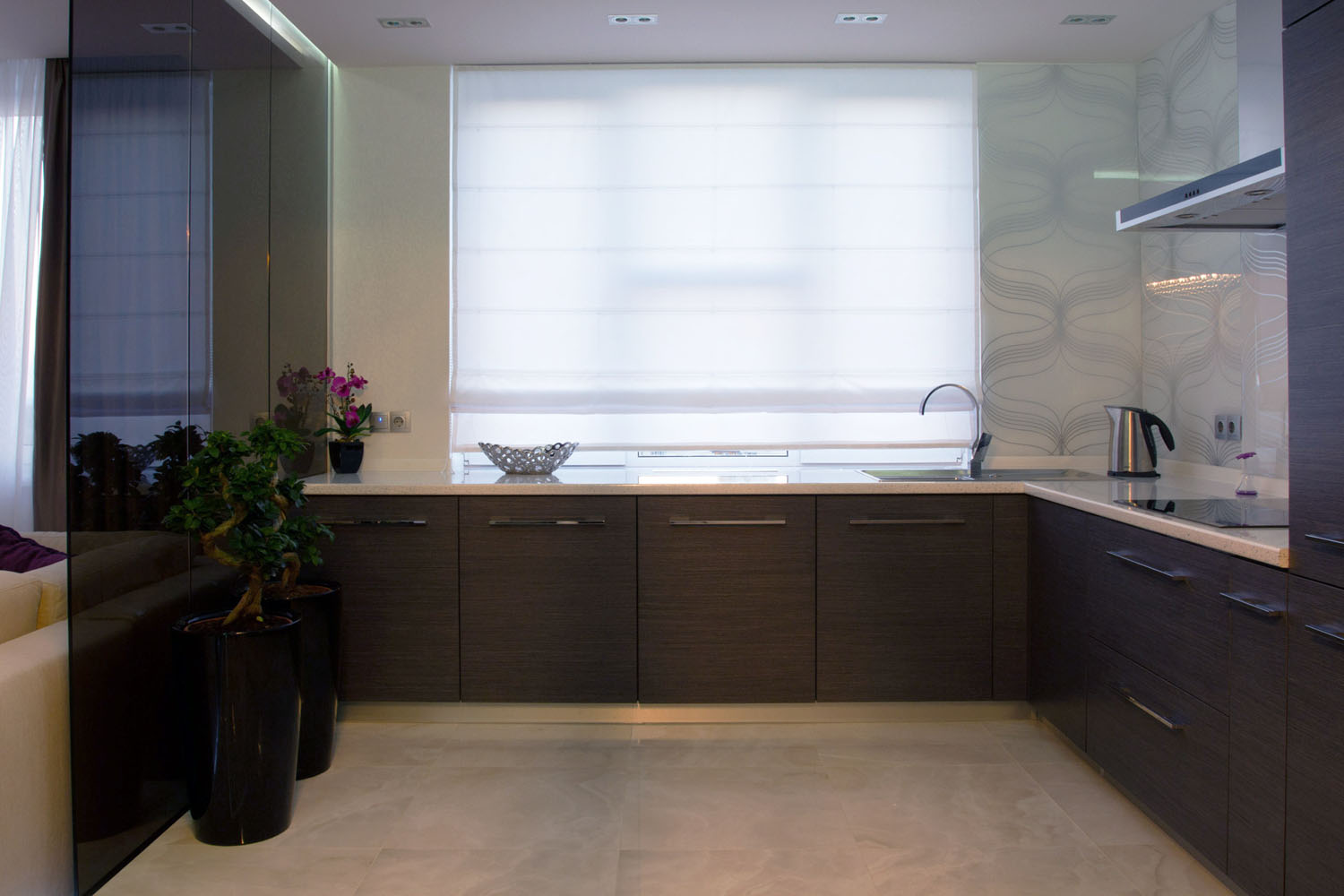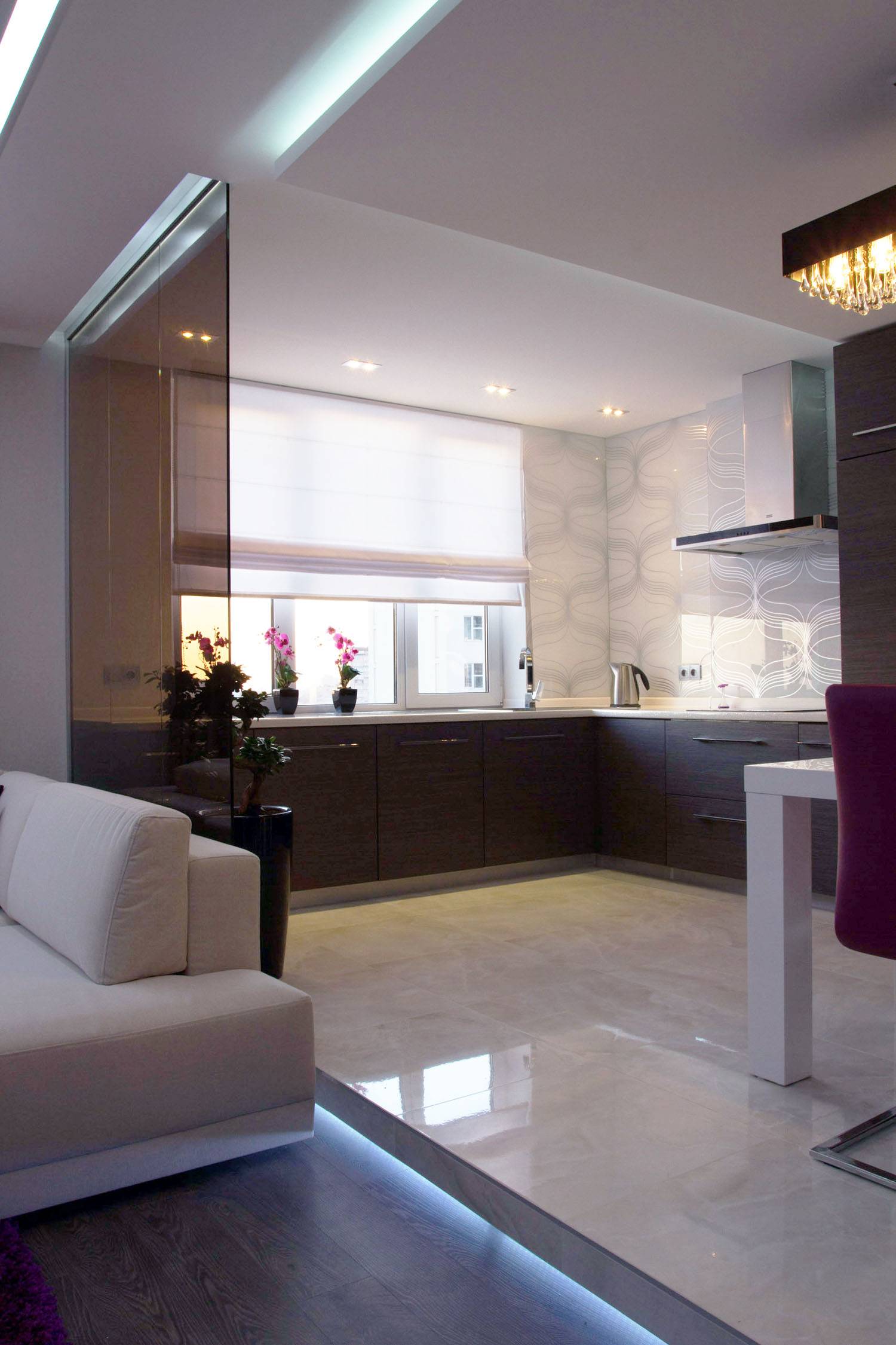 Ощущение, что студия находится не в многоэтажном доме, а на открытой террасе возле дома, достигнуто с помощью витринных бронзовых стекол, играющих также роль дополнительного зонирования. Для разделения пространства использован подиум, на котором расположилась кухонная и столовая зона. В сочетании с опущенным потолком подиум сыграл решающую роль в очертании «террасного» интерьера, а подсветка добавила эффекта «парения в воздухе». Рядом расположена уютная лаунж-зона с белыми диванами. Ее освещение выполнено с помощью мощных LCD-лент, скрытых в потолочных нишах под акриловым стеклом.