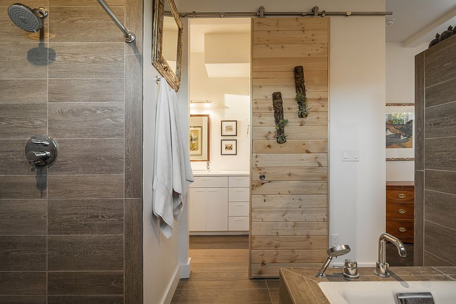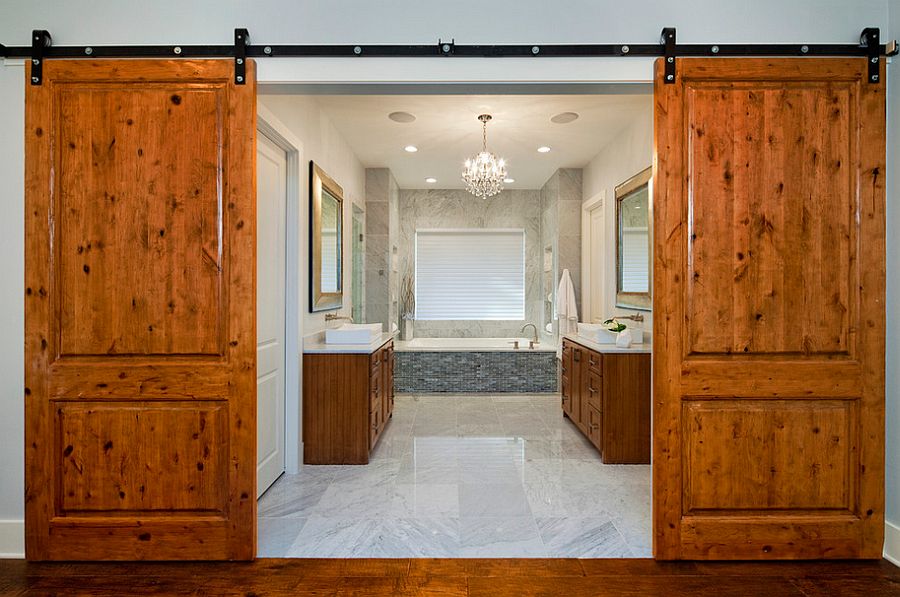 — вместо обычной двери можно использовать так называемую амбарную дверь, которая отлично подчеркивает этот стиль, а также помогает сохранить пространство